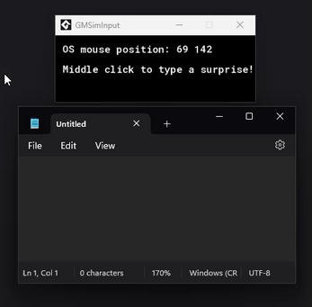 SimInput is a GameMaker extension for Windows that lets you simulate mouse and keyboard input. This can be used for interfacing with your game or even other programs programmatically, as if you were clicking or typing manually. Useful for automating testing of your game, or developing macros for other software.